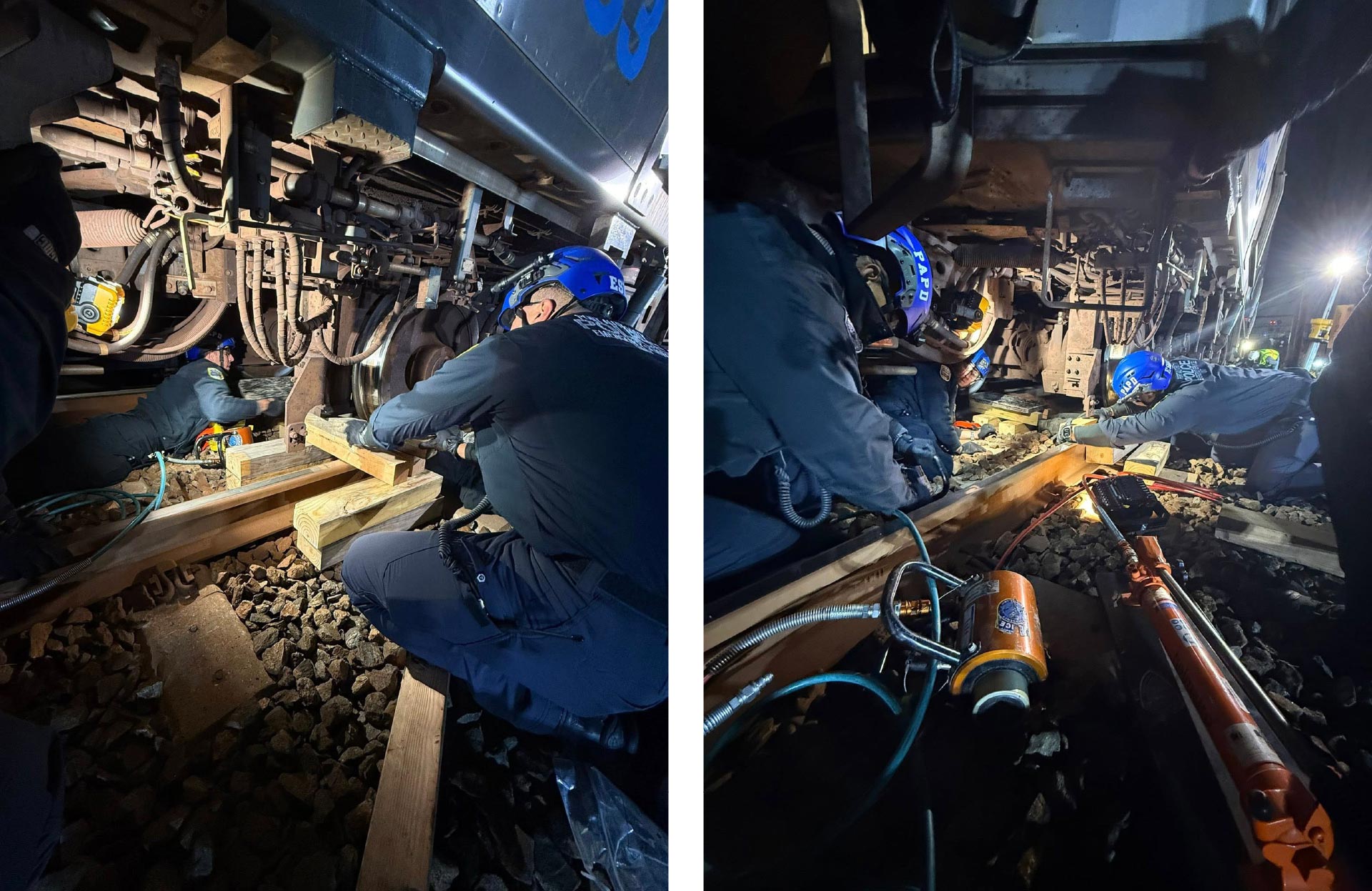 PAPD ESU members used their skills, experience and specialized equipment to lift the 35-ton train car and stabilize it, ensuring it would not cause further injury to the victim or pose a risk to rescuers. Once the train was safely lifted, the victim was removed, assessed and transferred to the care of EMS.