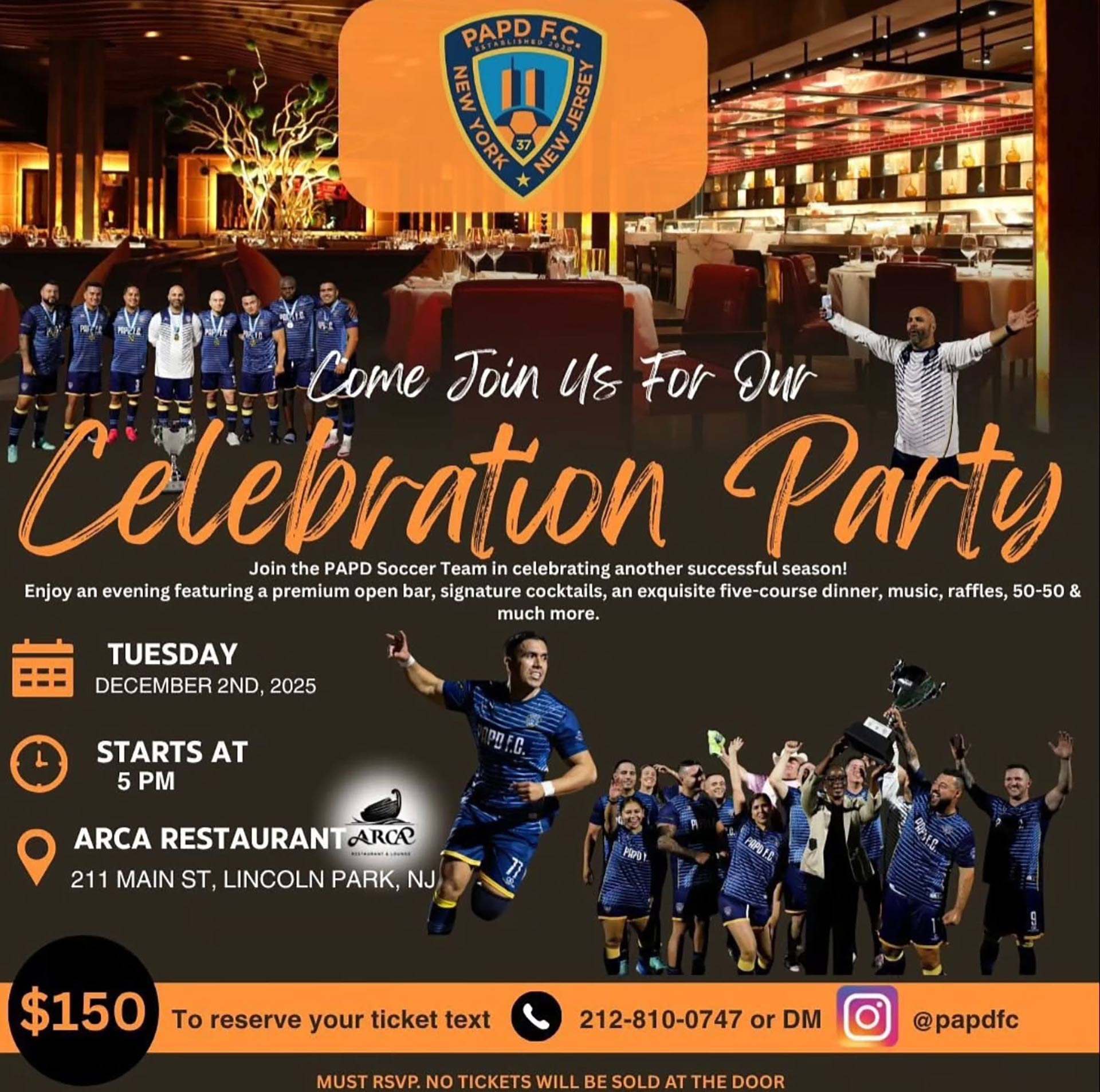 Join the Port Authority Police Department Soccer Team in celebrating another successful season on December 2! Enjoy an evening featuring a premium open bar, signature cocktails, an exquisite five-course dinner, music, raffles and more at Arca Restaurant in Lincoln Park. Please RSVP by calling (212) 810-0747 or by sending a direct message to PAPD F.C. on Instagram at instagram.com/papdfc.