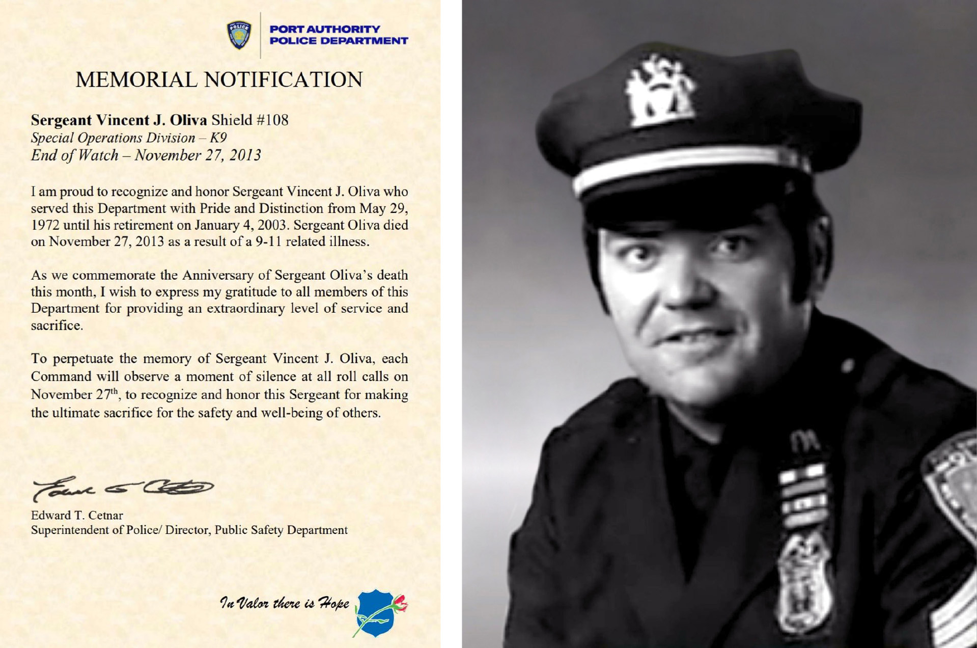 Sergeant Oliva succumbed to a 9/11 illness contracted during his heroic and selfless work in the toxic environment of the World Trade Center Rescue and Recovery Mission. He had served the people of New York, New Jersey and the millions using Port Authority facilities daily for more than 30 years.