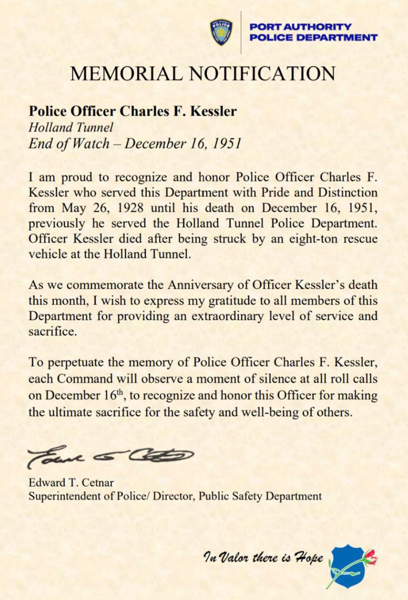 The members of the Port Authority PBA always honor and remember Port Authority Police Officer Charles Kessler (EOW 12/16/1951).